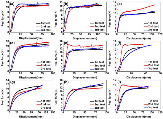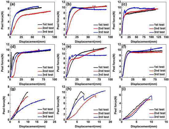 The peel curve of CFRP/EPDM composites. (a) CFRP/EPDM/DCP, 160 °C, 20 min. (b) CFRP/EPDM/DCP/S, 160 °C, 20 min. (c) CFRP/EPDM/DCP/TAIC, 160 °C, 20 min. (d) CFRP/EPDM/DCP, 160 °C, 30 min. (e) CFRP/EPDM/DCP/S, 160 °C, 30 min. (f) CFRP/EPDM/DCP/TAIC, 160 °C, 30 min. (g) CFRP/EPDM/DCP, 160 °C, 40 min. (h) CFRP/EPDM/DCP/S, 160 °C, 40 min. (i) CFRP/EPDM/DCP/TAIC, 160 °C, 40 min.
