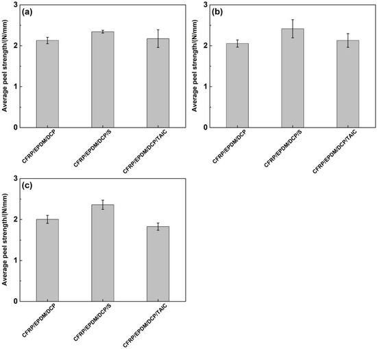 The average peel strength of CFRP/EPDM composites. (a) 160 °C, 20 min. (b) 160 °C, 30 min. (c) 160 °C, 40 min.