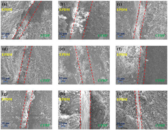 SEM images of CFRP/EPDM composite cross-sections. (a) CFRP/EPDM/DCP, 160 °C, 1 h. (b) CFRP/EPDM/DCP/S, 160 °C, 1 h. (c) CFRP/EPDM/DCP/TAIC, 160 °C, 1 h. (d) CFRP/EPDM/DCP, 170 °C, 1 h. (e) CFRP/EPDM/DCP/S, 170 °C, 1 h. (f) CFRP/EPDM/DCP/TAIC, 170 °C, 1 h. (g) CFRP/EPDM/DCP, 180 °C, 1 h. (h) CFRP/EPDM/DCP/S, 180 °C, 1 h. (i) CFRP/EPDM/DCP/TAIC, 180 °C, 1 h.