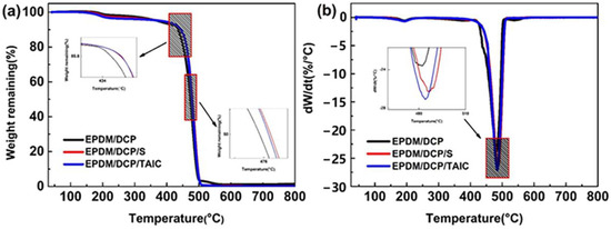 Thermogravimetric (TG) and differential thermogravimetric (DTG) curves for the pyrolysis of EPDM rubbers are shown Figure 9a,b. Compared to EPDM/DCP, Ti, Tp, and Tf of EPDM/DCP/S and EPDM/DCP/TAIC are dramatically higher, but the char yield of EPDM/DCP/S and EPDM/DCP/TAIC has a slight decrease. This indicates that EPDM/DCP/S and EPDM/DCP/TAIC have higher thermal stability than EPDM/DCP [41,42]. It is attributed to the incorporation of S and TAIC, both of which could enhance the crosslink degree of EPDM rubber, thereby improving the thermal stability of EPDM rubbers [43,44]. The thermogravimetric analysis results of EPDM rubbers are described in Table 3.
