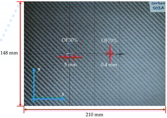 The sample contained two artificial flaws (cuts) manufactured with a diamond blade. Two semi elliptical cuts with a thickness of 0.4 mm and a length of 5 mm were made on the longitudinal axis of the plate symmetry. The relative maximum depth of the cuts is 30% (OF30%; OF stands for Outer Flaw) and 70% (OF70%) of the material thickness, respectively. The outer flaw means that the transducer was scanned over the opposite side of the specimen. The photo of the sample is shown in Figure 1.