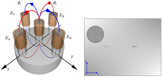 Schematic view of the differential eddy current transducer and arrangement over the sample. EA, EB, EC, ED—excitation coils, S—pick-up coil, core—ferrite core, φx, φy—magnetic fluxes generated by the pairs of excitation coils.