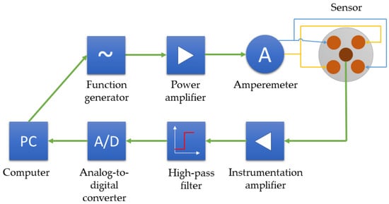 Figure 4 shows a simplified block scheme of the measuring system. The system comprises the eddy current differential transducer (Figure 3), a function generator, amplifiers, an analog-to-digital converter, an amperemeter, a high-pass filter, and a control computer. First, the computer sends the parameters of the requested excitation (amplitude, frequency, gain) to the function generator, which produces an analog excitation voltage on this basis. Then, the power amplifier boosts the voltage signal and passes it to the excitation coils of the transducer. The amperemeter between the amplifier and the transducer enables observation of the excitation current. Subsequently, the instrumentation amplifier boosts the output voltage from the transducer, and the Butterworth fourth-order high-pass filter reduces lower-frequency interferences. Eventually, the converter transforms the output voltage from its analog form into digital, which is saved in the computer for further analysis.