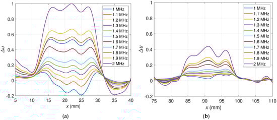 Figure 6 presents a set of curves representing relative voltage differences for distinct frequencies as a function of transducer position along the x-axis. The signals were plotted separately for the flaw OF70% and the flaw OF30% due to the significantly different values. As shown in Figure 6a for the flaw OF70%, the curves for the frequencies 1 MHz–1.6 MHz are quasiconvex and increase their values along with the frequency rise. It is noticeable that the extreme signal values corresponding to the flaw location are negative for frequencies between 1 MHz and 1.1 MHz. For frequencies above 1.1 MHz, the extreme signal value around the flaw is positive. Starting from the frequency 1.7 MHz, the shape of the curve changes to quasiconcave and continues to grow the peak value. Figure 6b presents the signals measured for the flaw OF30%. One can observe that curves representing relative voltage as a function of transducer position differ from those obtained for the flaw OF70%. Peak values of the signals are positive for all the excitation frequencies. The transition from the quasiconvex to the quasiconcave curve shape occurs for a frequency of 1.3 MHz. Similarly to the signals for the flaw OF70%, the peak values increase with the rise of the excitation frequency.