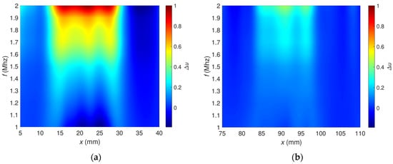The signals obtained for different frequencies can be presented in a single plot called a spectrogram. In this case, the abscissa corresponds to the transducer position x, the ordinate corresponds to the frequency f, and the colors represent the value of the signal. Figure 7 shows the spectrograms for both artificial flaws. The flaw OF70% (Figure 7a) is readily detectable across the entire frequency spectrum. A different situation occurs regarding the flaw OF30% (Figure 7b). The flaw is barely visible for the frequency values from 1 MHz up to 1.5 MHz. Its visibility improves for the higher frequencies. Both flaws are most detectable for the frequency of 2 MHz, which is close to the natural resonance frequency of the transducer circuit.