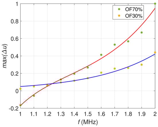 Maximum relative voltages as a function of the excitation frequency. The red line approximates data for OF70%, while the blue line approximates data for OF30%.