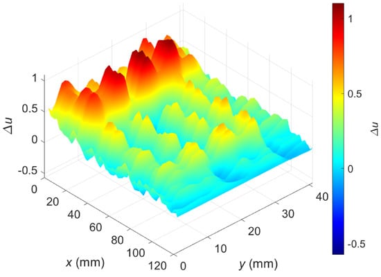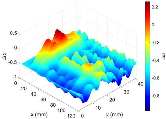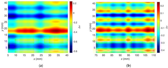 Figure 9 shows the relative voltage difference as a function of the transducer’s position along the x-axis and y-axis. The flaws OF70% (Figure 10a) and OF30% (Figure 10b) are detectable, but a high material anisotropy caused by the fiber alignment affects the results. Especially for minor hidden flaws, this makes it more difficult to detect and localize them. The undoubted advantage of the presented transducer, sensitivity to defects of different orientations in the case of anisotropic materials such as carbon fiber-reinforced composites, generates interfering signals that make analysis more complicated. The problem can be overcome by changing the design of the transducer or by using image processing algorithms involving background removal. This study proposed a dedicated background removal algorithm (Figure 11).