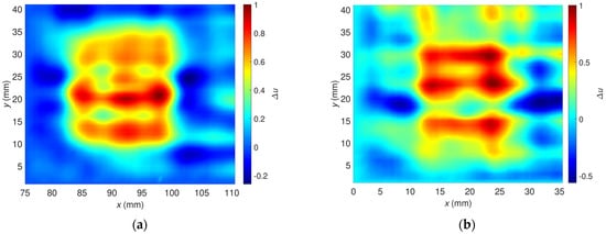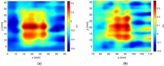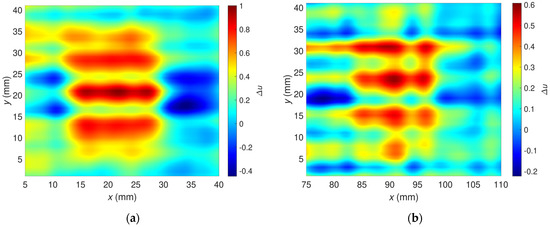 Figure 13 shows a two-dimensional plot of the measured relative voltage after background signal removal (the whole measurement area with both flaws was included). Compared to the signal before processing (Figure 9), one can observe that the interferences caused by the heterogeneity of the carbon fiber-reinforced composite were minimized and both flaws are detectable.