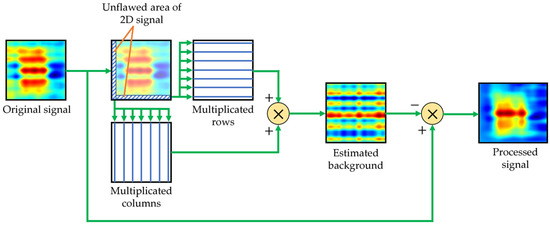 The algorithm block scheme is shown in Figure 11. Rows and columns from the signal’s data matrix, corresponding to the unflawed part of the sample, are selected and multiplicated. On their basis, the signal background is estimated. The procedure ends with subtracting the estimated background signal from the measured signal. Examples of the signal background estimated for OF70% and OF30% are depicted in Figure 12.