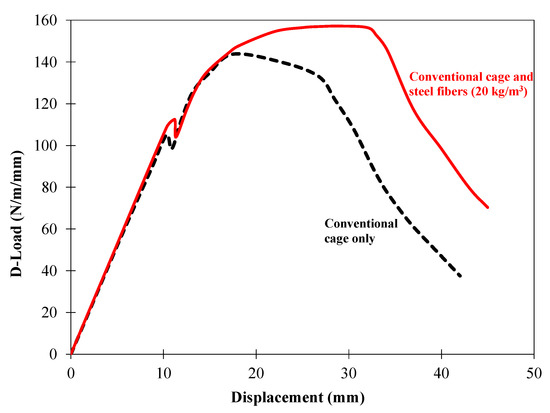 - The splitting tensile strength and flexural strength of all fiber-reinforced concrete mixtures were consistently higher as compared to the plain concrete mixture without fibers. The concrete mixture incorporating hybrid fibers (30 kg/m3 of bundled steel fibers and 10 kg/m3 PP fibers) exhibited much better improvement in flexural strength (24% higher), residual flexural strength at small and large deflections (4.39 MPa at L/600 and 3.89 MPa at L/150, as compared to nil for plain concrete mixture), and toughness (23 times higher) in comparison with the plain concrete mixture without fibers.