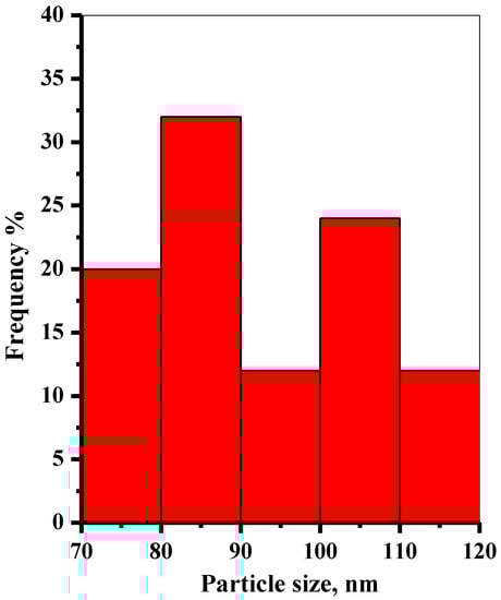 Scanning electron microscopy (SEM) was applied to study the surface morphologies of the prepared P@SiO2 nanocomposite. The SEM images of typical phosphate-doped silica (Si-P) nanoparticles are shown in Figure S1a–d. The prepared nanoparticles are spherical and have a diameter range (85–173 nm). The dimensions of the P@SiO2 nanoparticles were determined using image J software from the SEM captures in an original magnification of 30,000× and 50,000×. The average diameters and diameter distributions for 25 randomly selected isolated nanoparticles were measured and averaged, as represented in Figure 1. The data obtained showed that the morphologies of the synthesized P@SiO2 nanocomposite are relatively homogenous.