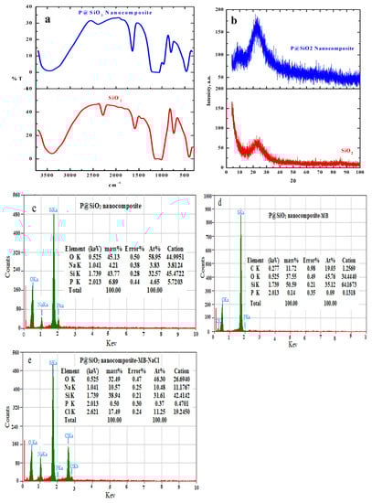 (a) FTIR spectrum of SiO2 and P@SiO2 nanoparticles, (b) XRD pattern of SiO2 and P@SiO2 nanoparticles, and EDS analysis of (c) Si-P and (d) P@SiO2-MB and (e) P@SiO2-MB-NaCl powder.