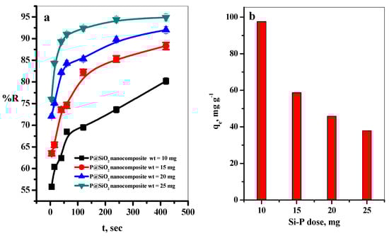 The effect of contact time on the adsorption percentage (%R) of MB dye was tested using various P@SiO2 nanocomposite adsorbents mixed with a defined concentration of MB dye (10–25 mg/10 mL) at a period of 0.0–400 s. The removal percentages (%R) of the MB dye increased linearly with the time increase to 100 s (Figure 3a). This is an attractive property of the promising P@SiO2 nanocomposite and gives it added value to use as an effective and economical adsorbent material in wastewater treatment processes.