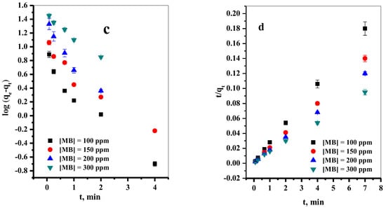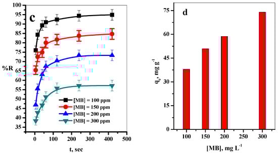 The effect of the initial MB dye concentrations on the removal percent (%R) and the equilibrium adsorption amount of the MB dye by P@SiO2 nanocomposite from an aqueous solution was investigated (as in Figure 3c) using initial MB dye concentrations ranging from 100 to 300 mg L−1 at adsorbent dose = 25 mg/10 mL, pH = 7, and T = 25 °C. It was observed that the %R increased with the time of the initial concentration to 100 s. After that, the equilibrium state was reached, as shown in Figure 2c. Moreover, the adsorption capacity of MB dye (qe) increases with a further increase in the initial dye concentration in the range (100–300 mg L−1), as presented in Figure 3d. The reason for this may refer to the increase in the MB dye concentrations causing improvement in the concentration gradient’s driving force, which accelerates the MB dye species’ diffusion velocity into the P@SiO2 nanocomposite adsorbent particles []. Then, the concentration gradient reduces due to the adsorption of MB molecules on the active sites of the P@SiO2 nanocomposite.