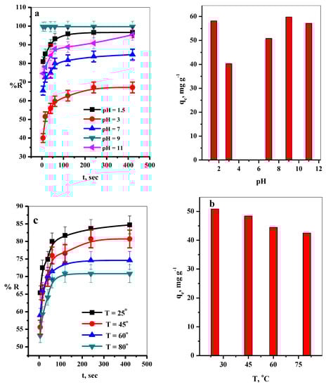 Effect of (a) pH, (b) effect of pH on qe values, (c) effect of temperature, and (d) its effect on qe values, on the adsorption of MB dye at different contact times ([P@SiO2] = 25 mg, [MB] = 150 mg/L/10 mL, T = 25 °C) and (d) temperature ([P@SiO2] = 25 mg, [MB] = 150 mg/L/10 mL, pH = 7).