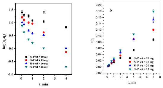 The kinetics of the MB dye adsorption on the P@SiO2 nanocomposite for various P@SiO2 nanocomposite doses were tested in contact times ranging from 0.0 to 7.0 min, and the results obtained are illustrated in Figure 5a,b. The calculated kinetic parameters are summarized in Table 1. As shown in Table 1, the correlation coefficient (R2) related to the pseudo-second-order is higher than that obtained for the pseudo-first-order. Moreover, the calculated maximum adsorption capacity for the pseudo-second-order matches well with the experimental data. This indicated that the adsorption kinetics of various P@SiO2 nanocomposite doses were described very well with the pseudo-second-order. For this model, it is suggested that the rate-limiting step might be chemical adsorption for the adsorption of MB dye onto P@SiO2 nanocomposite [].