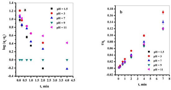 The calculated parameters of the pseudo-first-order and pseudo-second-order kinetic model for various pH values.