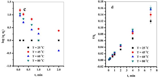 The influence of the temperature, ranged from 25 to 80 °C, on the %R of the MB dye from aqueous media onto P@SiO2 nanocomposite at pH = 7, [MB] = 150 ppm, [P@SiO2 nanocomposite] = 25 mg/10 mL was investigated and is represented in Figure 4c. It was found that the %R of the MB dye increased with the time the temperature degrees were used overall. Consequently, the removal percentages decreased as the temperature increased, as illustrated in Figure 4c. Furthermore, as the dye solution temperature rose, the adsorbate’s maximum adsorption capacity decreased [], as plotted in Figure 4d. This can be attributed to the exothermic nature of the adsorption process.
