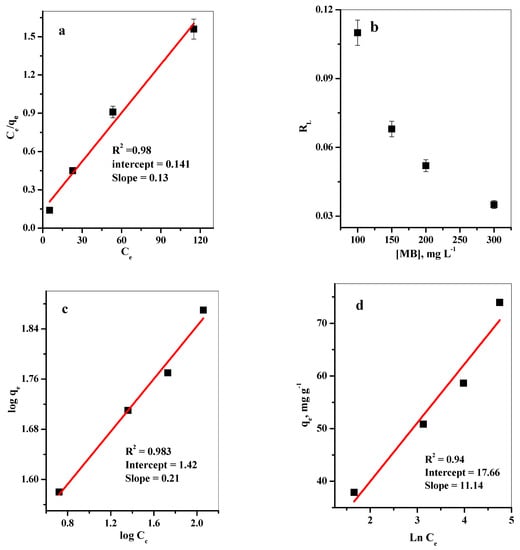 The Freundlich isotherm suggested a heterogeneous surface with non-equivalent energetic binding sites. The Freundlich constants can be calculated by plotting ln qe versus ln Ce (Figure 7c and Table 5). From the data in Table 5, 1/n < 1, which suggests a normal Langmuir isotherm.