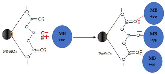 The P@SiO2 nanocomposite was prepared by combining sodium silicate and sodium phosphate. Hence, the binding sites, which were responsible for the interaction with the MB species, were mainly composed of silanol and phosphate groups. Upon contacting with the positive MB species pollutants in the aqueous media, the negative binding sites P@SiO2 nanocomposite interact with the MB species through ionic bond and oxygen lone pair sharing. The proposed adsorption mechanism is illustrated in Figure 8. The electrostatic attractions between the positive MB species and the negative active sites of P@SiO2 nanocomposite mainly depends on the reaction pH [,]. In an acidic environment, the H-atom will convert Si=O into Si-OH which will enhance the activity of these groups towards interaction with the positive MB species. On the other hand, as the pH of the media increases, the ionization of P-O− Na+ groups increase, which will increase the affinity of the P@SiO2 nanocomposite towards the MB species. Also, the H-bonding becomes dominant in the adsorption mechanism and plays a vital role to improve the adsorption capacity [,]. P@SiO2 nanocomposite and MB dye have many N-atoms; therefore, the adsorption capacities are enhanced due to the formation of N-H…N bonds between P@SiO2 nanocomposite and MB species.