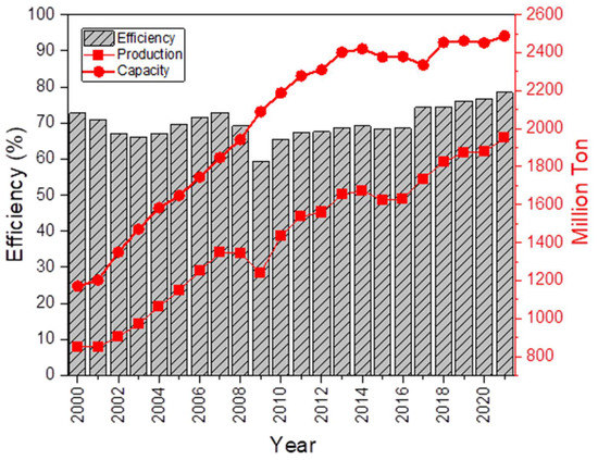 Global annual steel production, production capacity, and efficiency of the iron and steel production system (data till December 2021). Adapted from [1,3,8].