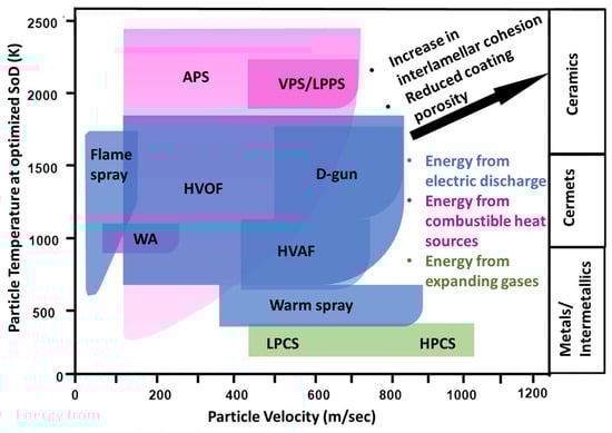 Simplified classification of thermal spray processes according to their source of heat generations, particle velocities and temperatures. APS = atmospheric plasma spray, VPS = vacuum plasma spray, LPPS = low pressure plasma spray, WA = wire arc, HVOF = high velocity oxygen fuel, D-gun = detonation gun, HVAF = high velocity air fuel, LPCS = low pressure cold spray, HPCS = high pressure cold spray, SoD = stand-off distance. Adapted with permission from [16]. 2014 Taylor & Francis.