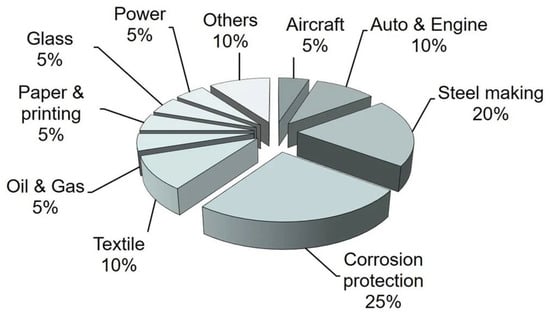 Figure 3 [19] shows that steel production integrates five processes: (i) iron making, (ii) steel making, (iii) continuous casting, (iv) rolling, and (v) main products shaping. Surface modification by thermal spray processes plays a major role in steel making, casting, and shaping. In China, thermal spray contributes about a 20% share to industrial applications during the manufacture of steel [20] (Figure 4). Specific uses include components of electric arc and basic oxygen furnaces that degrade due to harsh conditions imposed by thermal shock, thermal cycling, high operating temperatures, and corrosive slag fumes, and gases [21]. Furnace hoods, ducts, gas injecting tuyeres, lances, nozzles, and a multitude of steel processing rolls all experience thermal, mechanical, and chemical degradation [22]. As well, rolls and casters deteriorate and cause production downtime in continuous casting and shaping processes where heat, corrosion and wear are adverse operational environments.