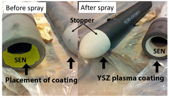 Molten steel is poured from the furnace into a ladle and then into the tundish, from where it enters the continuous casting machine through a shroud that is termed as the submerged entry nozzle (SEN) [29]. The outer SEN lining is thermal spray coated to avoid damage due to molten steel slag and to prevent clogging, as represented in Figure 9 and Figure 10 [23,43]. Svensson et al. [23] developed atmospheric plasma spray yttria-stabilised zirconia (YSZ) coatings for nozzles, SENs and stoppers to prevent clogging during continuous casting of steels. The total mass of the steel teemed through the nozzles increased with a YSZ coated nozzle and the tendency for clogging of the nozzle was reduced, with the nozzle clogging factor being reduced from 0.44 to 0.15. In addition, Memarpour et al. [30] developed glass coatings for SENs and improved casting performance in the casting process.