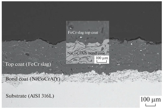 Cross-sectional SEM image of FeCr slag coating as an alternative coating material for caster rolls a continuous casting line. Adapted with permission from [9]. 2022, Springer Nature.