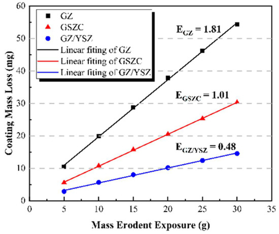 Coating mass loss as a function of erodent exposure for gadolinium zirconate (GZ), gadolinium zirconate and yttria stabilized zirconia (GZ/YSZ), and gadolinium-zirconate-blended feedstock (GSZC) thermal barrier coatings. Reprinted from [91].
