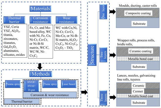 Takatani and Kobavashi [75] found that thick (200 μm) HVOF coated WC-Co coatings, with spray dried feedstock, dissolved in a zinc bath within 48 h. However, negligible thickness loss was observed after 96 h for a sintered/crushed feedstock and the same HVOF process. Similarly, Jarosinski et al. [76] demonstrated that the corrosion and oxidation resistance of WC-Co HVOF sprayed coatings improves on reducing the carbide grain size from 3 μm to 1 μm, on keeping the cermet composition fixed. The authors found that, oxides such as YSZ and Al2O3 are potential corrosion and oxidation resistant coatings for the submerged hardware of the galvanizing line due to their minimal wetting by molten zinc. Furthermore, multilayer coatings with Co- and Mo-based bond coats (e.g., CoCr and MoB), a middle layer of oxide-based ceramics (Al2O3-TiO2), and a top coat of YSZ are an alternate solution to the thin and short life oxide coatings. The multilayer coatings have significantly higher resistance to dissolution than the WC-Co and WC-CoCr coatings in Galvalume® baths due to the CoCrMoB phase formation. (Galvalume® is proprietary steel with a coating consisting of 55 wt% aluminium, 43.4 wt% zinc and 1.6 wt% silicon over the base metal). Figure 15 represents a summary of TS coating methods, materials, and coating routes that have been implemented for various types of hardware of the iron and steel making industry.