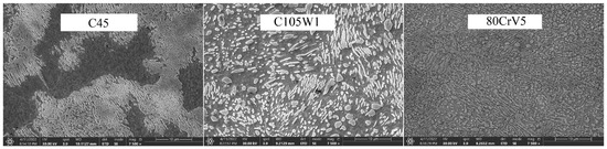 Again, increasing the time to 900 and 3600 s does not lead to a significant decrease in the hardness. For the C105W1 and 80CrV5 steels, there is a statistically significant difference in the observed hardness for the specimens preheated at 140 s and 3600 s. For steel C105W1, a significantly lower carbide density was observed (heating time 3600 s). Although there were not quite significant changes like with steel 80CrV5, the presence of any cracks was not detected (see Figure 11). The changes in the hardness values are undoubtedly accompanied by changes in some other mechanical properties, such as the microhardness, tensile strength, and impact test.