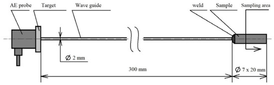 The basic heat treatment was performed on a premade test set (see Figure 2) consisting of a steel sample placed on a waveguide made of austenitic stainless steel, which does not have its own phase transformation in the monitored temperature range from room temperature to 800 °C or 830 °C. The heat treatment was performed in an electric laboratory furnace MP 05–1.1. This device offers the possibility of placing a sample connected to the waveguide, where the AE probe is placed outside of the heated area of the furnace (see Figure 2). The connection with the waveguide was ensured by a fusion weld using the tungsten inert gas (TIG) method. For the experiment, a Dakel XEDO 080 AE (4 MHz sampling, Hořovice, Czech Republic) unit was used. The assembly was connected to the AE probe via a 35 dB amplifier. An AE probe IDK 09 (20–1 MHz) with a corundum surface layer was used for the experiment. In the acoustic emission spectrograms, the amplitude is given in mV. Due to the nature of the analysed processes, the hit mode EA measurement technique was used. A target with an acoustic emission signal probe was also welded at the end of the waveguide. The entire test set-up was introduced into the furnace using a feeding device, which guaranteed the same start time of the measurement. The temperature of the waveguide and AE probe was maintained at a room temperature of 22 °C with a maximum deviation of 5 °C. The temperature measurement of the AE probe was provided by a non-contact thermometer. In order to avoid unwanted thermal effects caused by welding the waveguide to the test specimen, a sample area of 12 mm from the free end was defined. This distance was metallographically verified. The accurate measurement of the heating times was critically necessary for the further research. The sample—wave guide—AE probe test set was used in an experiment performed by [13], when an acoustic emission signal generated by the formation of a martensitic structure during hardening was monitored.