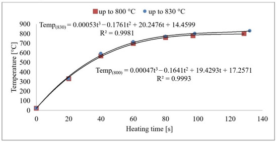From the measurements, it can be concluded that the sample’s core reaches the austenitising temperature in 120–140 s. The heat transfer process is plotted graphically in Figure 3. As the heating rate increases, the temperature hysteresis between the surface and the component’s core will increase during the heating process. However, these temperatures will level off during the delay period. A risk factor is the development of internal stresses due to temperature differences in the core and surface layers. Based on the developed mathematical model, the exact values of the sample temperatures can be derived as a function of the heating time. After the time of 120/140 s is reached, the temperature in the furnace does not increase anymore, and the subsequent time delay takes place at a constant temperature.