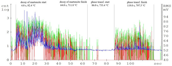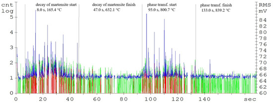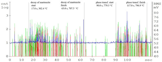 In contemporary publications, research on acoustic emission signals is based on the analysis of above-average signals and on the analysis of AE events [16]. Therefore, the start of the phase transformation was defined as a 20% steady-state increase in the acoustic emission event compared to the steady-state value.