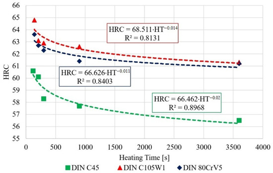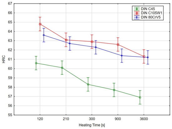 The hardness of all of the samples was measured identically, according to EN ISO 6508-1 using the HRC method. In terms of hardness, all of the samples show a rapid decrease in the hardness values during the first 250 s. The test results were subjected to an ANOVA and Tukey’s test for the statistical significance. For the C45 steel, there was a statistically significant difference (at a 95% significance level) in the decrease in the hardness of the samples with heating times exceeding 300 s. Additionally, for the C105W1 and 80CrV5 steels, there was a statistically significant difference between the measured hardness for the samples with heat loadings of 140 s and 3600 s. The overall decrease in the hardness ranges between 2.4 HRC for 80CrV5, 3.5 HRC for C105W1, and 3.7 HRC for C45 steel. Specifically, for the 80CrV5 steel, very significant changes that are incompatible with further use on machine parts were found in terms of the microstructure. The dependence of the exact austenitisation time on the mechanical properties was clearly demonstrated. As a consequence of the heating time, the phase structure modulation is associated with a reduction in the quality of the heat treatment and, thus, with the degradation of the mechanical properties. This statement can be clearly declared by the change in hardness of the tested steels.