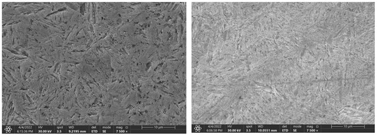 The Figure 9, Figure 10 and Figure 11 represent samples quenched in the laboratory. The left part shows the microstructure with the experimentally determined heating time and the right part shows the microstructure with the heating time of 3600 s. The microstructure of C45 steel is shown in Figure 9. The different heating time manifested itself mainly in the morphology of the martensitic needles.