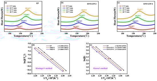 Non-isothermal DSC curves of the EP (a), FREP-2 (b), and FREP-4 (c) at different β and fitting curves of ln (β/Tp2) (d) and ln β (e) versus 1/Tp × 103.