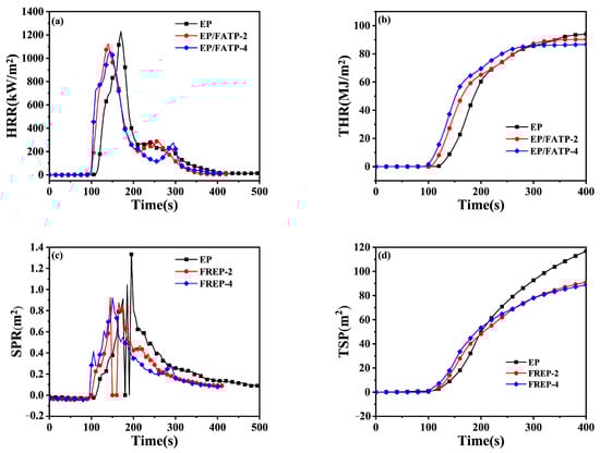 The THR and the peak of the HRR (the PHRR) are important parameters to characterize the combustion intensity. The pure EP burned intensely and gave the highest values of the THR (95.7 MJ/m2) and the PHRR (1229.3 kW/m2). Clearly, the values of both the THR and the PHRR tended to decrease with the incorporation of the FATP. For example, the FREP-4 sample achieved the lowest values of the THR (86.7 MJ/m2) and the PHRR (1059.3 kW/m2), which were decreased by 13.8% and 9.4% by contrast with the pristine EP, respectively. It confirmed that the incorporation of the FATP suppresses effectively the heat release during burning.