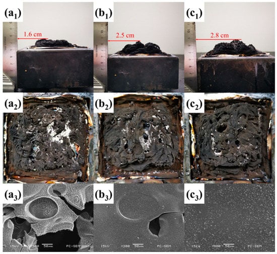 Digital photos and SEM micrographs of char residues after CCTs: (a1–a3) pure EP; (b1–b3) FREP-2; and (c1–c3) FREP-4.