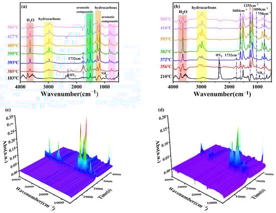 To better analyze the impact of the FATP in the gas phase, the gaseous volatiles released during the thermal decomposition of the pure EP and FREP-4 were detected via TG-FTIR. Figure 4 depicts the TG-FTIR spectra of the gases at different temperatures and the overall 3D TG-FTIR spectra. The main pyrolysis gases during the thermal decomposition of the pure EP and EP/FATP-4 were similar, including H2O (3622–3681 cm−1), aliphatic compounds (2750–3142 cm−1), aromatic compounds (3032 cm−1, 1600 cm−1, 1512 cm−1, and 827 cm−1), bisphenol A (1259 cm−1, 1337 cm−1, and 1175 cm−1), and carbonyl compounds (1732 cm−1). By contrast, in the spectra of FREP-4, some new characteristic peaks appeared at 1604 cm−1, 1255 cm−1, and 1050 cm−1, which contributed to the stretching vibration of P−O−Ph, P−O, and P−O−C, respectively. Therefore, it can be speculated that the decomposition of FATP produced ·HPO and ·PO radicals, which subsequently captured the reactive radicals such as H∙ and OH∙ to break off the combustion chain reaction. Two other peaks at 2309 cm−1 (HN3) and 919 cm−1 (NH3) were also found. Additionally, it was observed that the incorporation of FATP decreased both the initial temperature of the gas release (385 °C for the pristine EP and 356 °C for FREP-4) and the peak intensity. Figure S7 further shows the variations of the peak intensities of some representative flammable volatiles with the time. As seen, EP/FATP-4 gave a lower intensity than the pure EP, suggesting that the FATP plays flame-retardant roles in the gas phase through the suppression effect on the release of flammable volatiles.