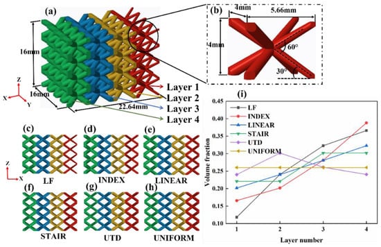 BCC FGLs were created using the Computer-Aided Design (CAD) software Creo ParametricTM 3.0 (Boston, MA, USA). Each printed structure maintains a rectangular cross-section of 16 mm by 22.64 mm and a height of 16 mm. Depending on the configuration and design, 4 unit cells span the cross section and height. It should be noted that the strut diameter of the BCC lattice structure was designed to vary continuously along the strut, which is intended to avoid the appearance of weak layers or discontinuous unit cells, and based on this, five of the lattice structures with different density gradient spans were designed and named sequentially as LF, INDEX, LINEAR, STAIR, and UTD. This naming rule is based on the curves of different density gradient changes, such as LF indicating that the density gradient change is a logarithmic function type, INDEX representing the density gradient change as index type, LINEAR standing for the density gradient change is a linear type, STAIR and UTD representing the density gradient change as a stair type and increasing followed by decreasing type, respectively. For comparison purposes, uniform gradient lattice structures were also created and named UNIFORM. Figure 1 not only shows the volume fraction profiles corresponding to different layers of the lattice structure with different density gradients, and also shows the configuration and geometry of the lattice structure and unit cell as well as the front view of each lattice structure with different density gradients.
