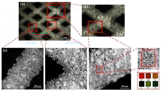 Figure 3 shows the macroscopic morphology of the representative lattice structure observed by OM (a,b) and the microscopic morphology of struts with different diameters observed by SEM (c–e), and the energy spectrum analysis of spherical particles on the surface of the strut (f). It can be seen that a large number of unmelted or partially melted spherical particles were presented on the struts and at the joints of the struts, which was also found in previous studies [,]. The spherical particles adhering to the lattice structure’s struts will increase the overall mass of the lattice structure. Moreover, when measuring the mass of the lattice structure in water, it is smaller than the actual one due to the presence of bubbles inside the lattice structure. This would explain the higher relative density of each fabricated lattice structure compared to the designed value shown in Table 2. However, the maximum error does not exceed 3.33%, and no defects such as deformation and cracking were found for different strut sizes and at the joints of the struts, which demonstrates that these unsupported lattice structures can be successfully fabricated using SLM. The particle size analysis showed that the particle size distribution of the spherical particles attached to the struts was similar to that of the TC4 titanium alloy powder particles of the molding material, with most of the particles attached to the struts having a particle size distribution between 15 and 53 μm. In addition, the energy spectrum analysis of these spherical particles also showed that the spherical particles attached to the struts were mainly caused by the adhesion of partially molten TC4 titanium alloy metal powder particles on the surface of the struts. The reason for this phenomenon is due to the characteristics of the SLM manufacturing process, as the laser energy in the center of the laser spot is the highest, and the surrounding energy gradually decreases, so that the powder around the melt pool is not sufficiently melted, and thus the powder will adhere to the surface of the cured material after cooling. Both the larger and smaller strut diameter struts have a large number of spherical particles attached, but in general, the diameter of the relatively larger struts has fewer spherical particles attached to them than the smaller ones. It can, perhaps, be illustrated that the accuracy of the strut-based lattice structures with larger strut diameters manufactured by SLM is higher than that of the smaller strut diameters. The same phenomenon was found by Al-Saedi et al. [], who fabricated the lattice structure of Al-12Si aluminum alloy with gradients using SLM and found that the error between the actual and design dimensions of the relatively large diameter strut was smaller than that of the smaller diameter strut. As can be seen from the SEM images in Figure 3, the stair-stepping effect is clearly evident, and these observations are also highlighted in []. The presence of the stair-stepping effect is likewise responsible for the roughness of the strut surface and the severe sticky powder phenomenon.