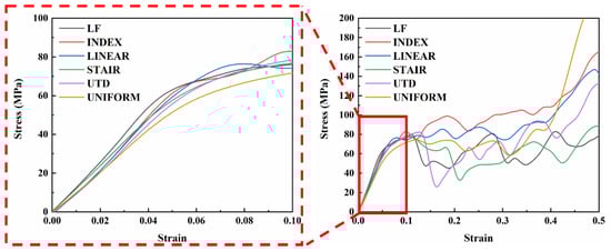 Figure 4 shows the compressive stress–strain curves of the lattice structure manufactured by SLM with different density gradients and uniform gradients perpendicular to the loading direction after the quasi-static compression test. For each different lattice structure, the first maximum compressive strength (defined as the first local maximum of the nominal stress–strain curve), the elastic modulus (defined as the initial linear slope in the nominal stress–strain curve), the compressive yield strength (obtained by the 0.2% offset method), and the plateau stress (defined as the average stress value in the strain range of 20% to 40%.), in accordance with ISO13314:2011 standard [], are given in Table 3.