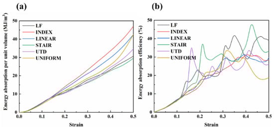 As seen in Table 3, the lattice structure with a density gradient perpendicular to the loading direction has a better elastic modulus, yield strength, and first maximum compressive strength than the uniform lattice structure. In particular, the elastic modulus of LF, the yield strength of LINEAR, and the first maximum compression strength of INDEX is 28.99%, 16.77%, and 14.46% higher, respectively, than that of the UNIFORM. The lattice structure with gradients perpendicular to the loading direction can significantly increase its strength compared to the uniform lattice structure with similar porosity. However, the plateau stress of UNIFORM is better than that of LF, STAIR, and UTD. The plateau stress will mainly affect the energy absorption of the lattice structure, which is discussed in detail in Section 3.2.2.