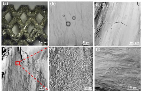 Optical microscope (OM) observation of the macroscopic morphology of the lattice structure (a,b); SEM micrographs of the struts with different diameters (c,e) and at the nodes (d), and energy spectrum analysis of the spherical particles on the surface of the strut (f).