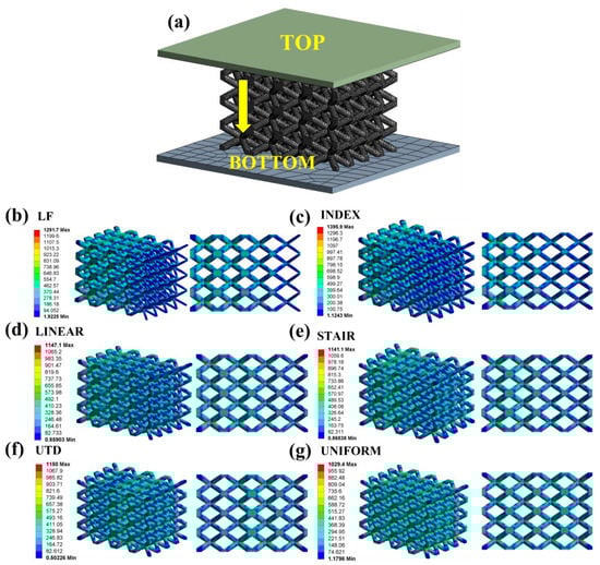 where , , , represent the reaction force of the bottom rigid body, the contact area between the top rigid body and the lattice structure, the displacement distance of the top rigid body, and the initial height of the lattice structure, respectively. It can be seen from the stress nephogram in Figure 9 that the stress modes of lattice structures with different density gradients are different, but the stress is mainly distributed at the joints of the struts. In addition, it can be seen from Figure 9b–d that the stress is mainly distributed in the parts with higher density. These results indicate that in the lattice structure with density gradient, the part with a higher density is the main bearing part. It can also be seen from the deformation behavior diagram of lattice structures under compressive loads (Figure 7) that the initial failure position of lattice structures with a logarithmic (LF), index (INDEX), and linear (LINEAR) density gradient occurs in the lower-left corner (the density of lattice structure decreases gradually from left to right in the direction shown in the figure). Similarly, it can be seen from the failure morphology diagram of the lattice structure after compression shown in Figure 8a that the location where the main failure occurs through the structure (near the connecting nodes of the struts) is consistent with the stress distribution location shown by the finite element analysis.