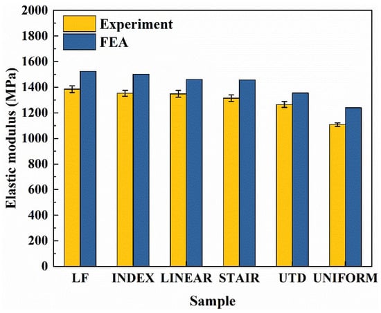 The results in Figure 10 show that the elastic modulus of various lattice structures predicted by the finite element method is higher than the experimental value, which is predictable due to the forming characteristics of SLM. There will inevitably be some defects in the lattice structure in the SLM process [,,,,], which will affect the mechanical properties of the lattice structure to a certain extent. However, in general, the maximum error is less than 11.9%, and the trend of elastic modulus of lattice structures with different density gradients predicted by the finite element method is equivalent to the experimental value. Therefore, in future lattice structure design, the finite element method can be used for preliminary prediction, which is of great significance for future lattice structure design.