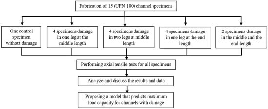 Therefore, in order to elucidate the behavior of damaged channel steel elements, the current study investigated the effect of damage to the unconnected legs on the maximum load capacity, average stress distribution, and final elongation. The variables investigated were the ratio of damage depth, the location along the element’s length, and the side of the damage. These impacts are critical to improving design codes and maximizing the application range while also maintaining safety standards. Figure 1 illustrates a scheme summarizing the protocol that was used in the current study.