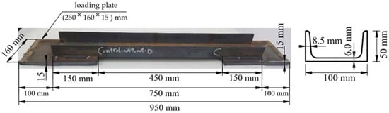 The experimental program comprised 15 specimens of steel channel of European standard (UPN 100), with a web width and thickness that was equal to 100 mm and 6.0 mm, respectively. The depth and thickness of the flanges were 50 mm and 8.5 mm, respectively, as shown in Figure 2. The total length of the specimen was 750 mm, and the effective length was 450 mm. The length of the specimens and the cross-section were chosen to match the maximum capacity of the testing machine and match what is used in steel structures. The loading plates were utilized, with the dimensions of all rectangular shapes being 250 mm × 160 mm and the thickness being 15 mm. The cross-section of the loading plate was chosen to be 2400 mm2 larger than the cross-sectional area of the channel in order to ensure that the failure occurred in the channel section and not in the loading plate. The loading plates were fixed to the specimens by welding. The welding consists of two lines that were equal to 150 mm (the length connected from the channel with the loading plate), with a welding size that was equal to 10 mm. In addition, there were two welding lines with a channel width that was equal to 100 mm; one was from the top at the edge of the channel with a size of 6 mm and another one was from the bottom of the channel with the edge of the loading plate with a size of 10 mm. For each specimen, two loading plates were installed at the edges of the specimen, and the fixation length was 150 mm on each side. The process of welding in the air was conducted through the use of the electric arc method (SMAW: shielded metal arc welding). The electrode types used in this process conformed to the AWS E6013 classification.